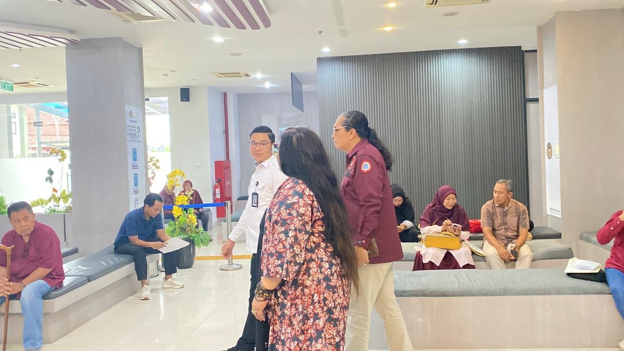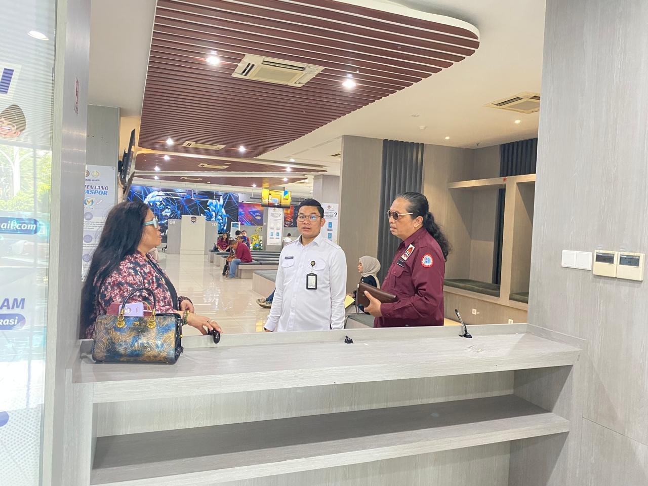 Kasi Pelayanan Verifikasi Dokumen Perjalanan Yopi Ariansah memandu langsung Ketua Presidium FPII Dra.Kasihhati dan Pengawas Dewan Pers Independen (DPI) Adv.Lilik Adi Gunawan, S.H.,melihat secara langsung antrean umum bagi pemohon paspor yang melakukan pendaftaran melalui aplikasi M-Paspor.
